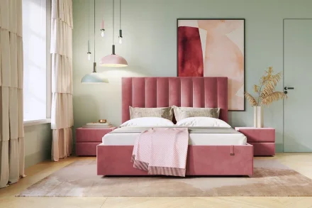 Кровать Ingrid подойдет для современных интерьеров спален, впишется в ретростиль и скандинавский минимализм. Обивка будет отлично сочетаться с любыми цветовыми оттенками отделки и мебели. Кровати выполнены как в нейтральных, так и в ярких тканях велюр, что позволяет подобрать подходящий вариант почти под любой интерьер. Изголовье имеет прямоугольную форму, повторяя очертания кровати. Дизайн модели отличается высоким изголовьем с вертикальными строчками и углублениями.